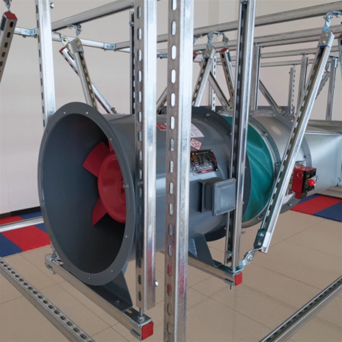 暖通局部:(1)管道不應穿過抗震縫,當必須穿梭時,須在抗震縫兩邊各裝一個柔性管接頭或在通過抗震縫處裝置“門”形彎頭或設伸縮節(jié);(2)鍋爐房、制冷機房、熱交換站內(nèi)的管道應有堅固的側(cè)向跟縱向抗震支撐,多根管道共用管廊支架或管徑≥300mm 的單根管道支吊架宜采取門型管廊支架;(3)矩形截面面積大于即是0.38m2 跟圓形直徑大于即是0.70m 的風道可采取管廊支架,管廊支架的設置跟設計應合乎本標準第8章的請求。(4)防排煙風道、事變通風風道及其設備應采取管廊支架。