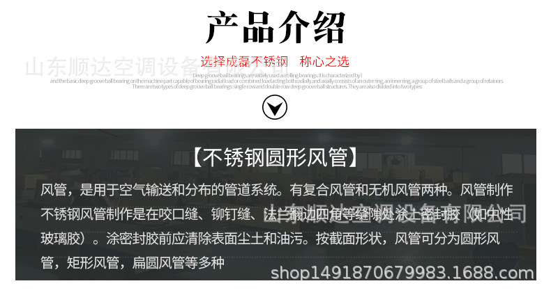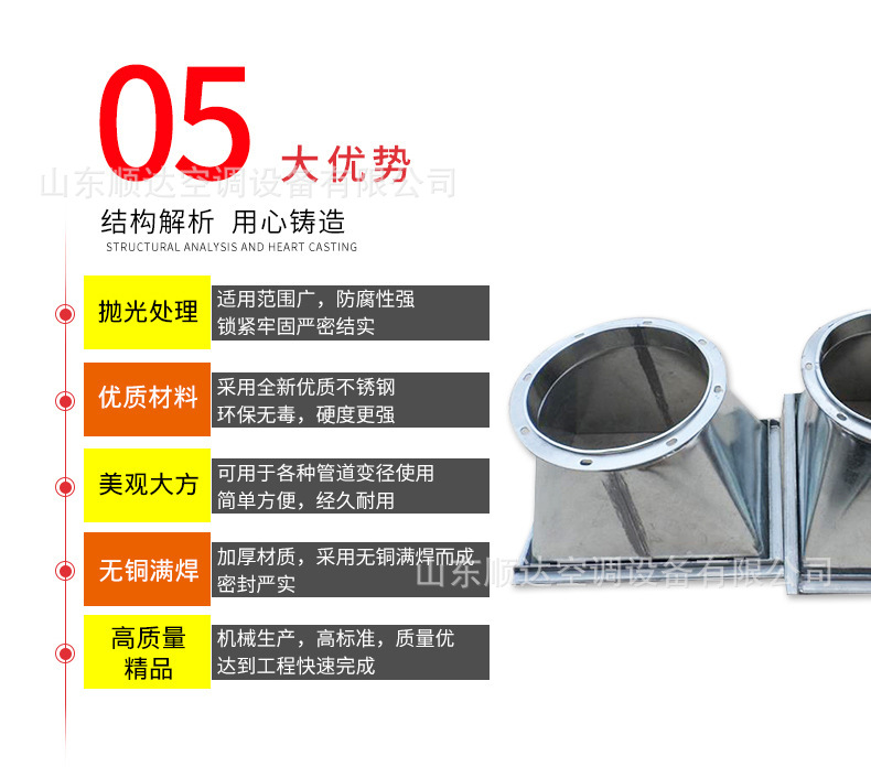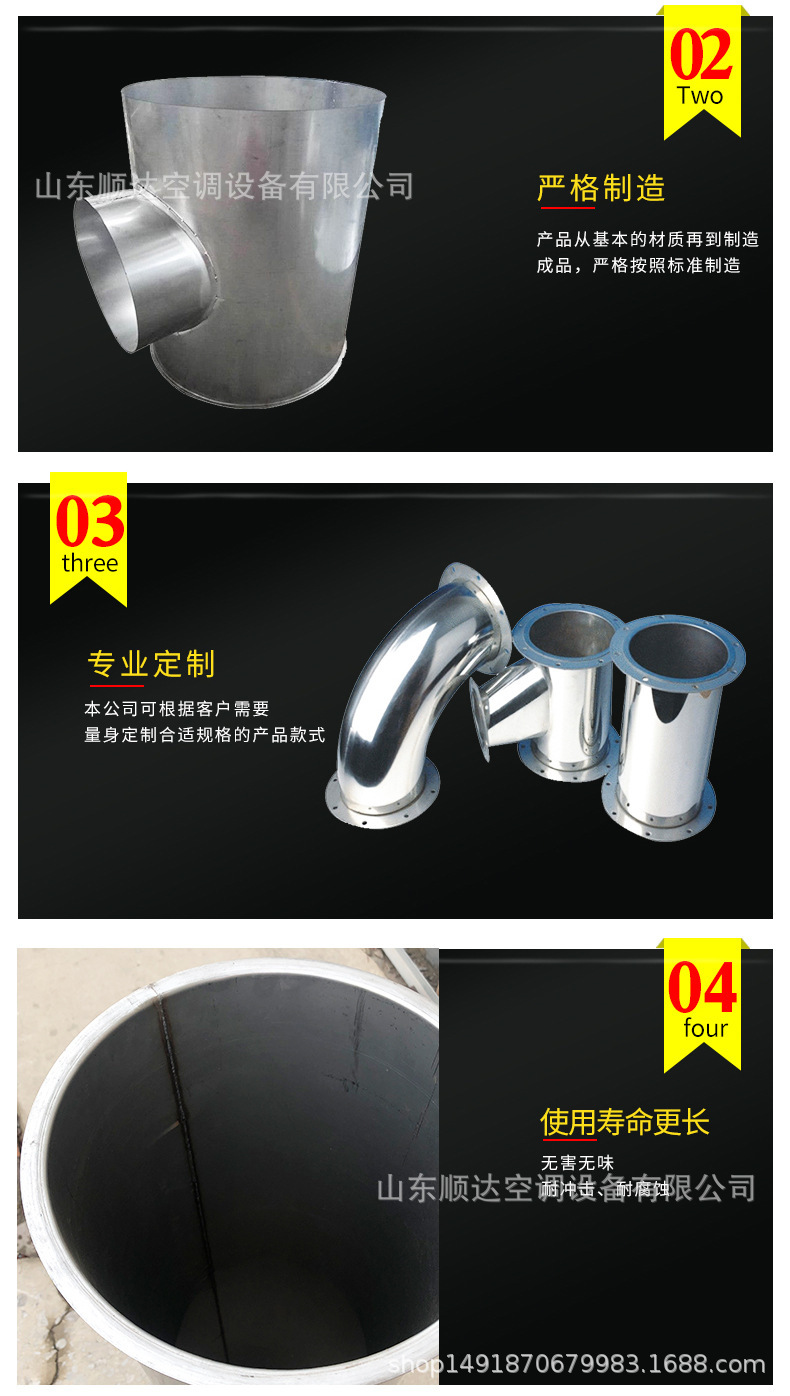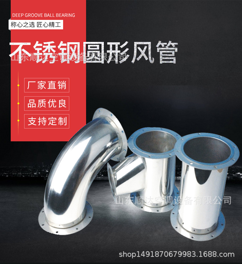 不銹鋼風(fēng)管,不銹鋼風(fēng)管可分為圓形和矩形兩種??筛鶕?jù)工程現(xiàn)場(chǎng)的不同要求,生產(chǎn)各種形狀、各種規(guī)格型號(hào)及板材的成品風(fēng)管。不銹鋼風(fēng)管主要材質(zhì)有:SUS304、316、303、310、310S、301、302、304L、316L 、321、201、202、902、904、317、430等。不銹鋼風(fēng)管表面性質(zhì)主要有8K鏡面板、彩色不銹鋼板、不銹鋼磨砂板、不銹鋼拉絲板、不銹鋼花紋板、不銹鋼蝕刻板、鈦金、雪花砂、2B板、BA板和工業(yè) [1] 中厚板。不銹鋼風(fēng)管成品因其優(yōu)異的耐蝕性、耐熱性、高強(qiáng)度等物化性能,主要應(yīng)用于多種氣密性要求較高的工藝排氣系統(tǒng)、溶劑排氣系統(tǒng)、有機(jī)排氣系統(tǒng)、廢氣排氣系統(tǒng)及普通排氣系統(tǒng)室外部分、濕熱排氣系統(tǒng)、排煙除塵系統(tǒng)等。